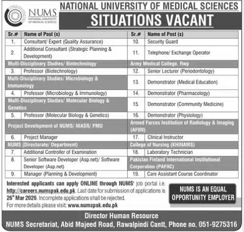 Applications must be submitted exclusively through the official NUMS careers portal before the deadline of 26 March 2026. Incomplete or manual applications will not be entertained. Candidates are advised to fill out the online form carefully and attach all required documents. For further information regarding the application process or the position, you can visit the official NUMS website.