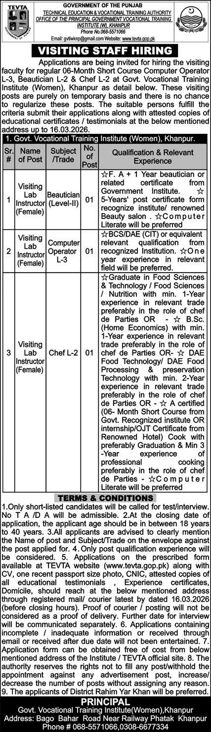 The Govt. Vocational Training Institute for Women (GVTIW) Khanpur, under the Technical Education & Vocational Training Authority (TEVTA), is seeking a qualified and experienced Visiting Lab Instructor (Female) for its Beautician (Level-II) course. This is a temporary position with no chance of regularization, and applicants from District Rahim Yar Khan will be preferred. The last date to apply is 16 March 2026.